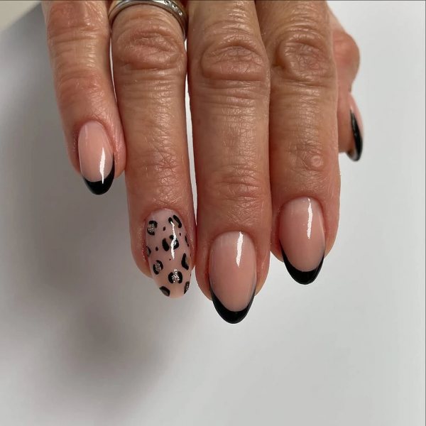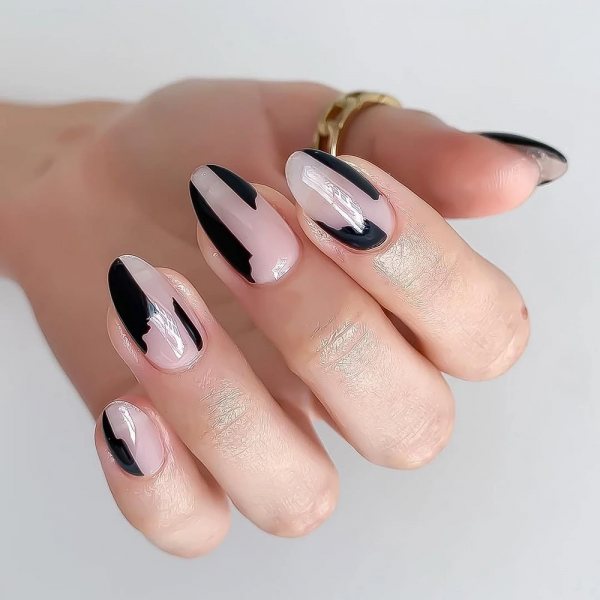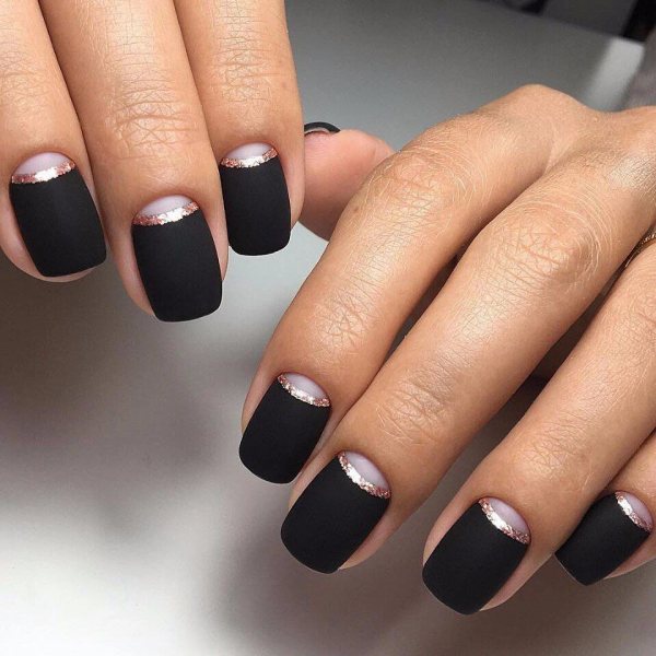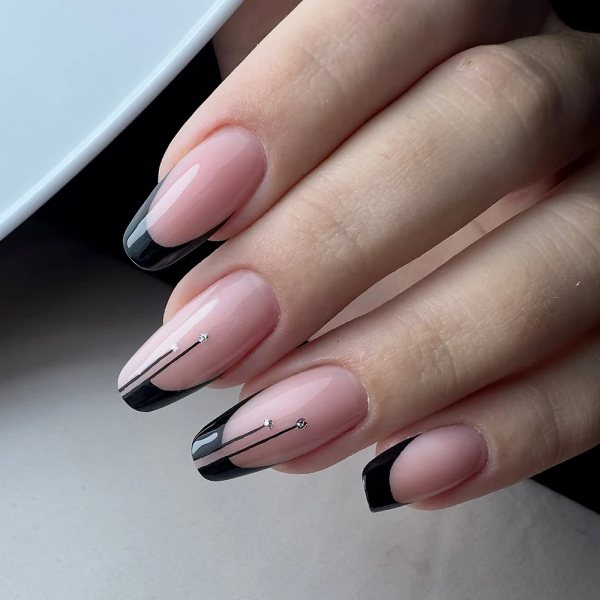 Первый вариант, который я люблю, — инвертированный френч. Черная линия проходит у основания ногтя, а остальная часть остается нюдовой или прозрачной. Такой дизайн выглядит графично и аккуратно. Пальцы визуально кажутся длиннее, что для многих из нас приятный бонус.