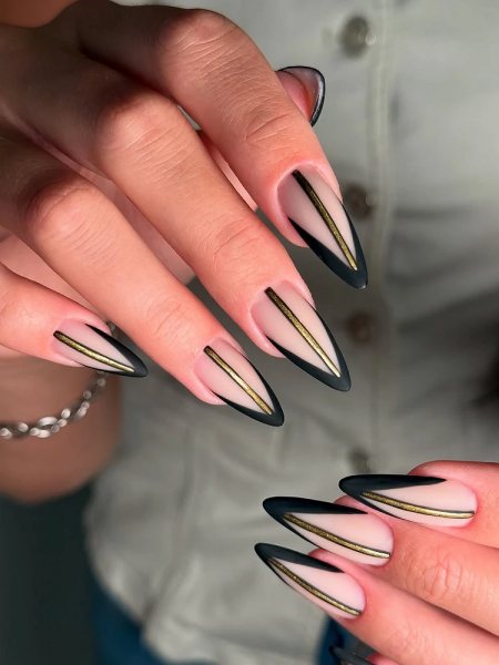 Очень люблю негативное пространство. Часть ногтевой пластины остается натуральной, а черным прорисовываются только детали. Например, аккуратная рамка по контуру или пересекающиеся линии. Выглядит легко, но совсем не скучно.
