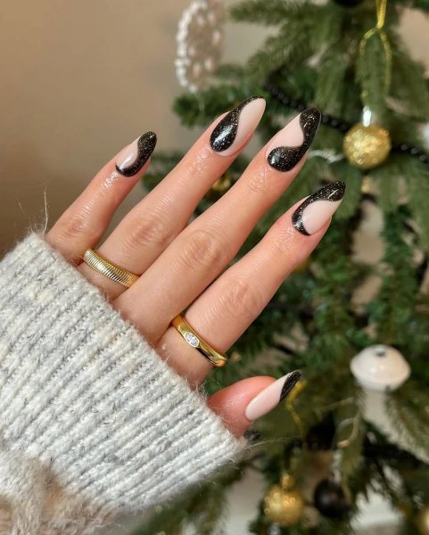 Зимой я разрешаю себе максимум блеска. Когда за окном снег и серость, хочется сияния. И черная база тут работает просто идеально. В 2026 году зимние варианты — это про роскошные детали без скромности.