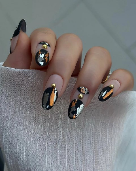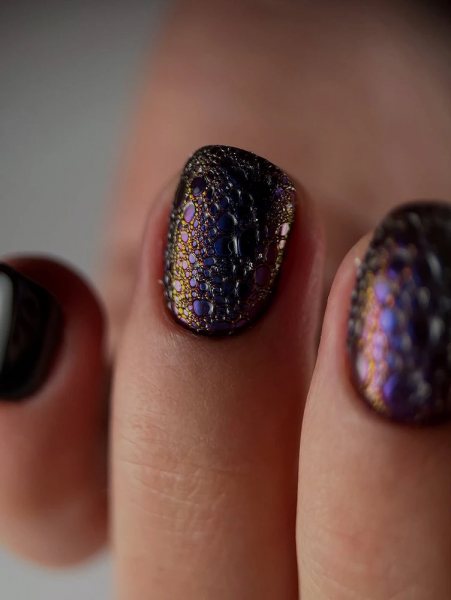 Стразы, глиттер, хрустальная крошка, металлические вставки — все это смотрится уместно. Я часто делаю классический прием: все ногти черные, а один акцентный буквально усыпан камнями. Лак под ними почти не видно, зато вау-эффект гарантирован. Можно пойти мягче — добавить мелкие стразы у кутикулы на каждом пальце. Получается эффект инея на темном бархате.