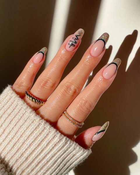 Кстати, металлическая фольга зимой тоже выглядит очень празднично. Неровные серебристые или золотые фрагменты на черном фоне напоминают огоньки гирлянды. Но я всегда слежу за балансом. Если декор активный, часть ногтей оставляю чисто черными.