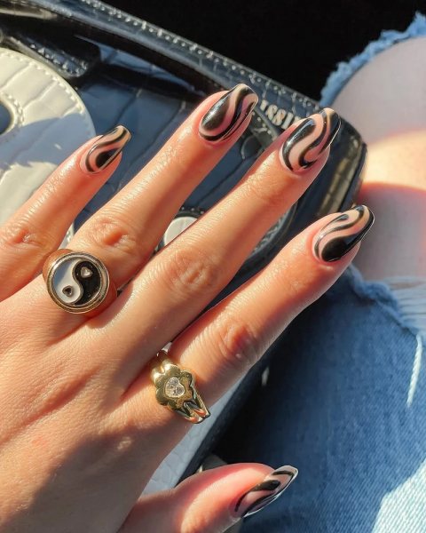 - И третий вариант — рисунки на черном фоне. Темная база работает как холст. Белые тонкие линии, минималистичные веточки, абстракция или даже надписи выглядят очень контрастно. Можно сделать лаконичный акцент, а можно устроить на ногтях настоящую мини-галерею.