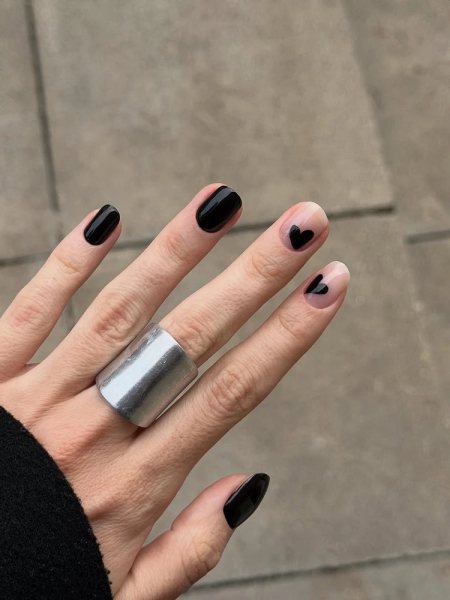 Весной я обычно убираю лишний блеск и перехожу к более легким решениям. И, как ни странно, черный тут тоже отлично вписывается. Главный фаворит сезона — современный черный френч. И он совсем не скучный.