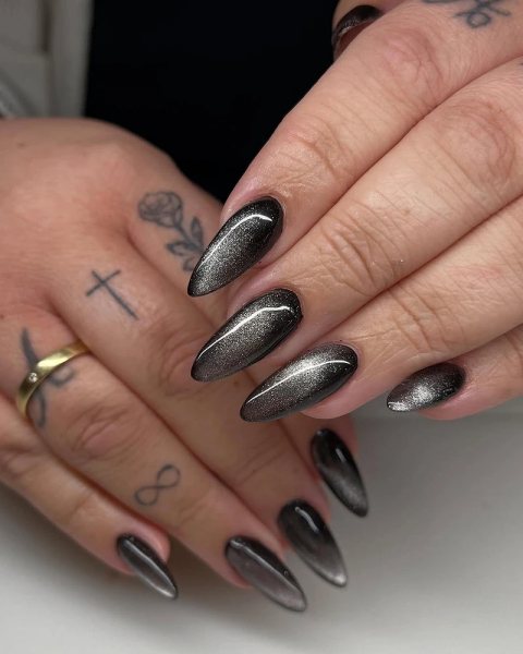 - Второй фаворит — «кошачий глаз». Это магнитный лак, который создает переливающуюся полоску света. На черной основе блик выглядит особенно загадочно. Можно направить его вертикально, по диагонали или горизонтально — каждый раз получается новый эффект. Сдержанно, но с изюминкой.